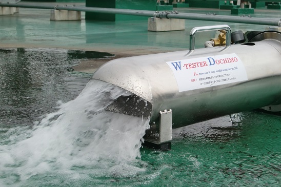 消火栓の放水圧力を測定する際には「テスト弁」と呼ばれるバルブの下にある「試験放水口」と放水圧力測定器の間を短い試験ホースでつないで行います。放水圧力の単位は「メガパスカル」と呼ばれ、通常は0.17(または0.25)~0.7の範囲内であれば「良」となります。ただ、通常「0.7」まで達することはまずありません。(H28年7月撮影)